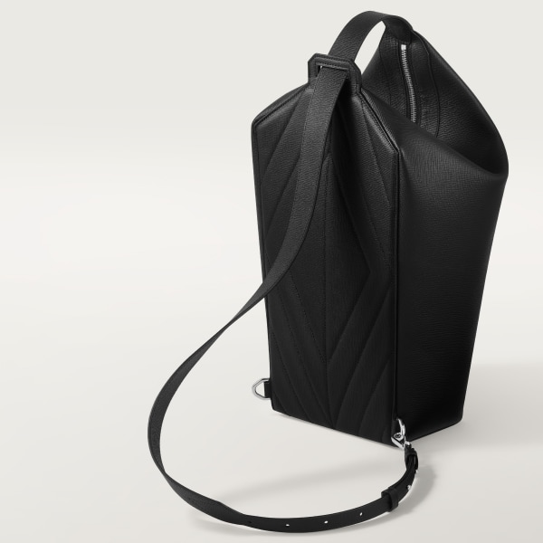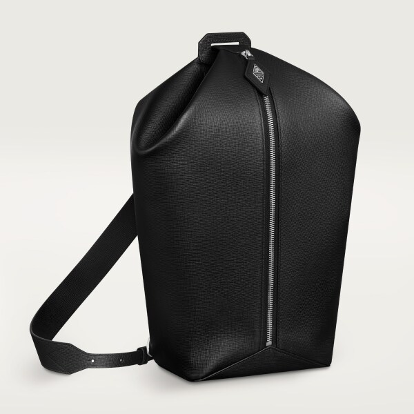 Cartier Losange black grained calfskin backpack. Exterior: Cartier signature Losange zipper, one zipped pocket, metal parts in palladium finish and enamel. Interior: black textile lining with silver-coloured "Cartier" signature. Dimensions: 150 mm high x 260 mm long x 370 mm wide. Shoulder carry with a long adjustable strap.