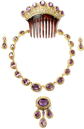 Necklace 42.5 cm; comb 11.3 x 12.0 cm; brooch 8.0 x 4.0 cm; earrings 4.0 x 1.7 cm