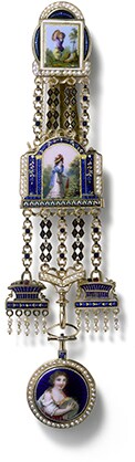 A chatelaine is a long chain worn since the 17th century at the waist by both men and women. Such chains were composed of ornamental plaques joined by various kinds of links. Attached to the chain would be a matching watch, often accompanied by several charms. This inspiring piece of decorative finery could attain a high degree of magnificence. Surviving with its original presentation case, this chatelaine is a perfect example of these richly elaborated pieces.