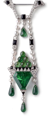 鉑金,古典切割圓鑽,一顆11.90克拉三角斜面形祖母綠,凸圓形和水滴形祖母綠,天然珍珠,縞瑪瑙。