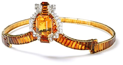 18K黃金,鉑金,古典切割圓鑽,長階梯形切割鑽石,一顆62.35克拉大號八角形祖母綠切割深色黃水晶,圓柱形長階梯形切割黃水晶,一顆六角形黃水晶。