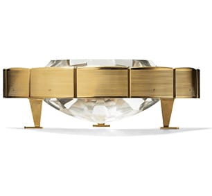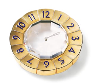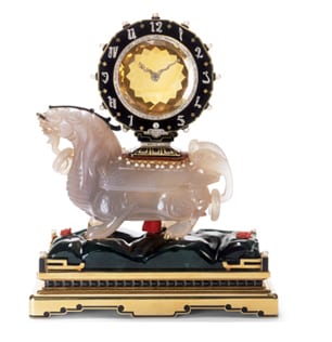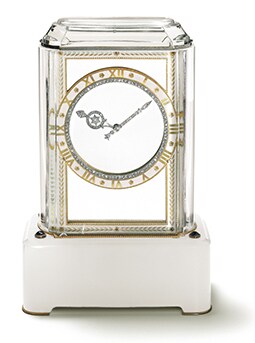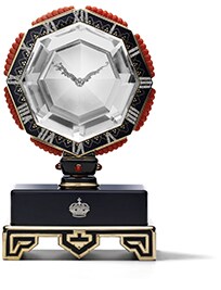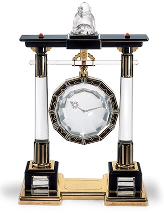 鉑金,18K黃金,水晶,白瑪瑙(底座),四顆凸圓形藍寶石,玫瑰式切割鑽石,白色琺瑯。 此款座鐘珍品十分罕見,是卡地亞首批神秘鐘之一。