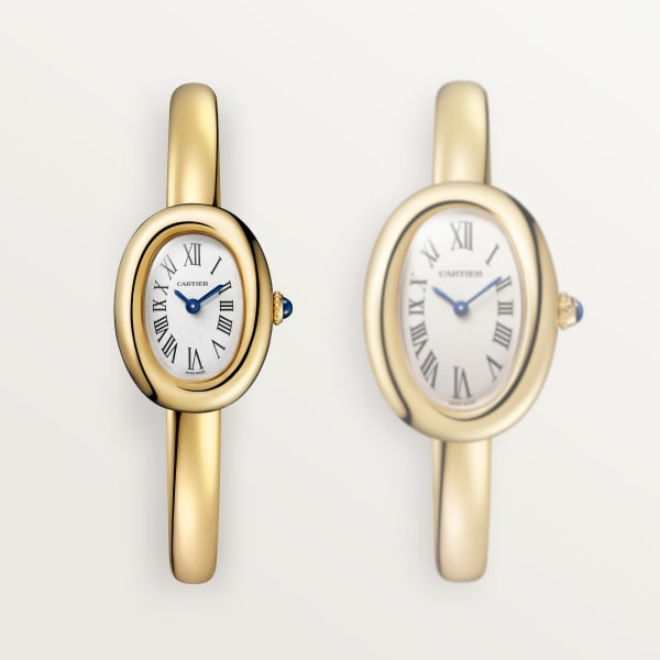 Baignoire de Cartier 腕錶,迷你款,尺寸:17,石英機芯。750/1000黃金錶殼。750/1000黃金珠粒裝飾錶冠,鑲嵌1顆凸圓形藍寶石。銀色錶盤,藍鋼劍形指針,藍寶石水晶鏡面。750/1000黃金錶鏈。長度:24.6毫米,寬度:18.7毫米,厚度:7.2毫米。防水深度3巴(約30米)。