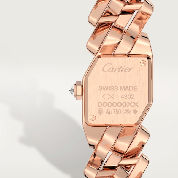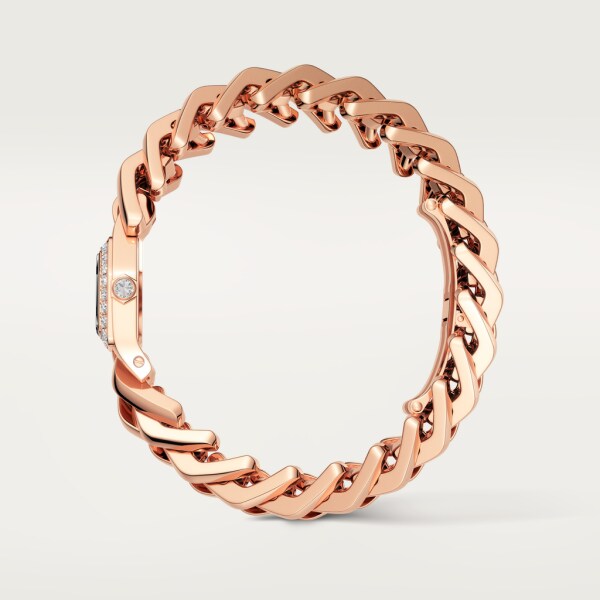 Maillon de Cartier 腕錶,石英機芯。750/1000玫瑰金錶殼及錶冠,鑲嵌25顆明亮式切割圓鑽,共重0.61克拉。尺寸:31 x 17毫米,厚度:6.8毫米。銀色錶盤帶陽光射線紋飾,藍鋼劍形指針,750/1000玫瑰金錶鏈。防水深度3巴(約30米/100英尺)。