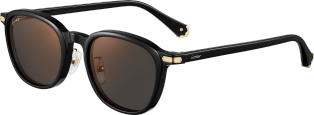 Première de Cartier 黑色醋酸纖維太陽眼鏡,光滑金色飾面金屬細節腳架,方形造型及灰色鏡片,金色鏡面效果。專為亞洲人士設計。尺寸:鏡片53毫米,鼻樑架21毫米,腳架145毫米。