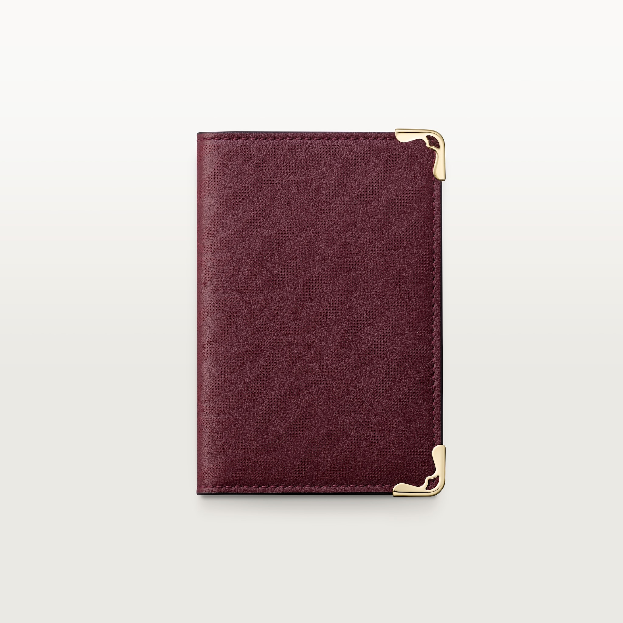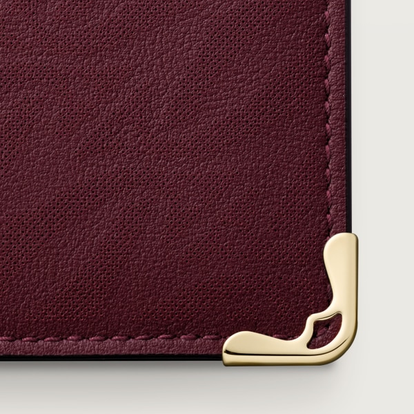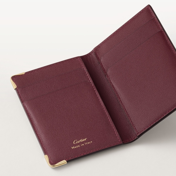 Must de Cartier 信用卡夾,可容納4張信用卡,酒紅色通花小牛皮。外部:通花 Double C 標誌,金色飾面金屬包角。內部:酒紅色小牛皮,金色 Cartier 標誌,4個信用卡格,3個平口袋。尺寸:高107毫米 x 寬71毫米。