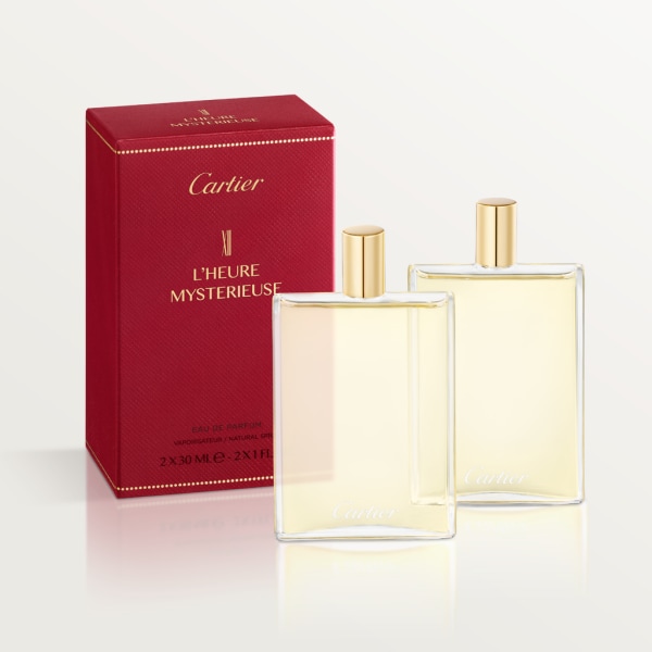 30毫升玻璃香水瓶補充裝,以磁石置入 Nécessaires à Parfum 香水盒中。可讓您隨心每天隨時替換香水,締造無限可能。卡地亞為您帶來一系列香水選擇。 XII L'Heure Mystérieuse 濃香水,2x30毫升 沉默彌漫,呼吸聲傳入耳間, 平靜即將打破。生活陶醉於茉莉花的柔和與廣藿香的馥鬱之中。 靜靜聆聽脈搏跳動,回顧人生,探尋私密的內心世界。 敞開心扉,直抵心靈,追溯真我。 那是欖香與香荽的白晝?抑或焚香與乳香的晚上? 刺柏的樹影即將消逝,不要緊張,首先細味 L'HEURE MYSTÉRIEUSE,在這一小時裡,探索自我的世界。