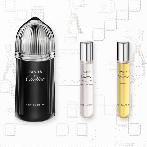 Pasha de Cartier 禮品裝(Edition Noire),100毫升淡香水、10毫升 Pasha de Cartier 香水(Edition Noire)及 10毫升 Pasha de Cartier 迷你噴霧(Edition Noire)。